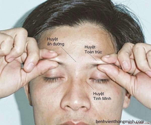 Bấm huyệt xung quanh nhãn cầu: dùng ngón cái bấm huyệt phía trong và phía trên hố mắt và dùng ngón trỏ bấm huyệt phía ngoài và phía dưới hố mắt, có tác dụng giúp khí huyết lưu thông trong hố mắt.
