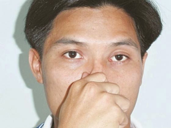 Day ấn các huyệt (hình trên cùng): toán trúc (đầu trong cung lông mày), ấn đường (giữa 2 cung lông mày), Tinh minh (khóe mắt trong) tương ứng xoang sàng trước: mỗi huyệt day ấn 10 - 20 lần.