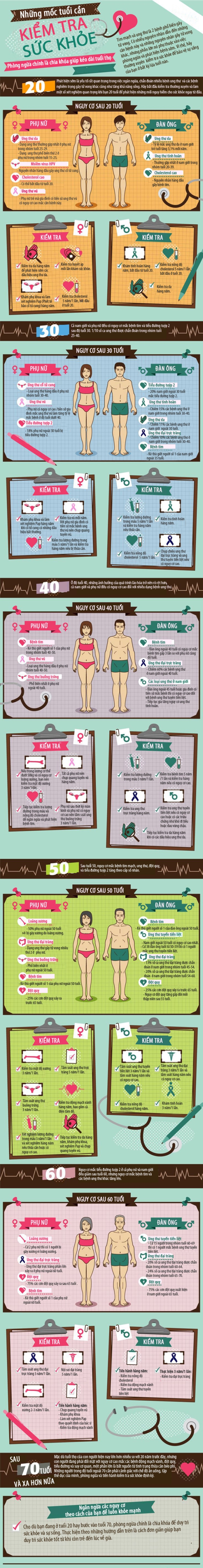 Ở độ tuổi 20, phụ nữ cần làm xét nghiệm Pap để tầm soát ung thư cổ tử cung. Nam giới nên lưu ý kiểm tra tinh hoàn. Tuổi 30, nữ giới lưu ý ung thư vú, và nam giới là đại trực tràng...