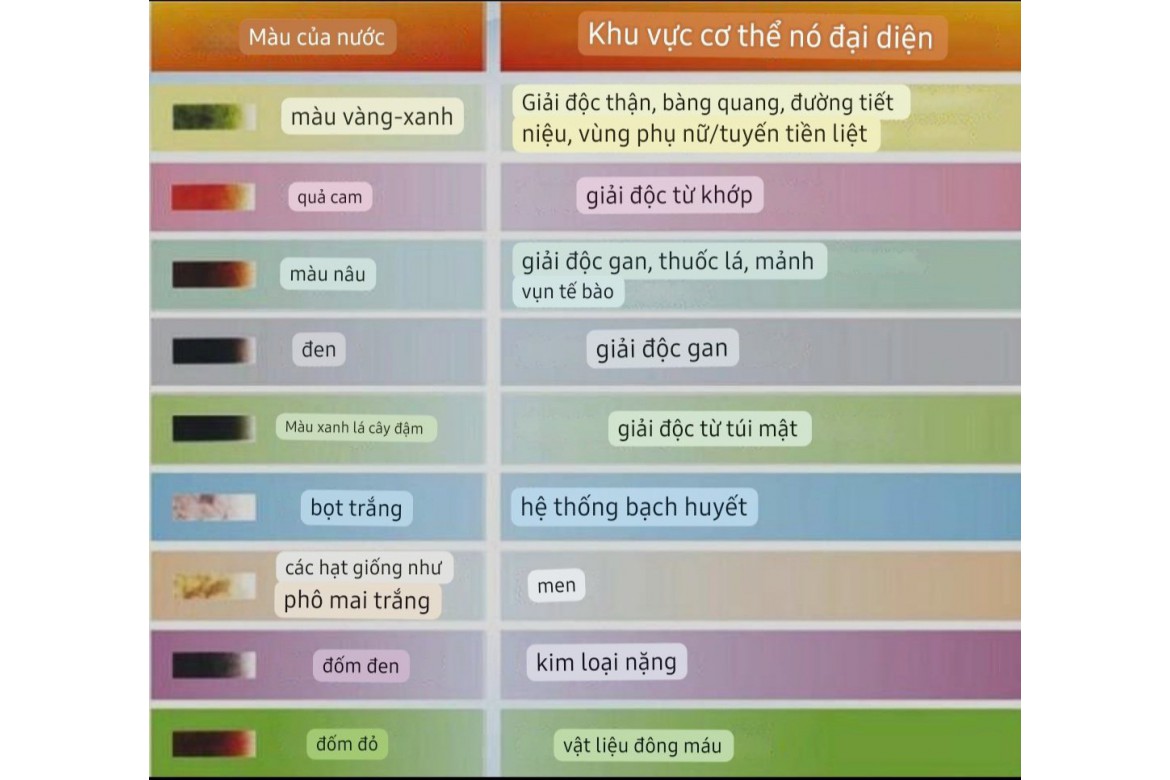Theo nguyên lý đã trình bày ở mục 1.1 thì ta có thể nhận thấy chất kết tủa trong châu chấu nằm chân đấm là chất độc thải ra từ cơ thể ngâm tẩm, bởi vì bản thân các tạp chất, nước tháo được khi phản ứng điện phân sẽ tạo ra các kết tủa. Chất độc trong người ngâm chân đấm được thải ra chỉ là một phần nhỏ trong đó. Nhưng phần lớn đó sẽ làm sự khác biệt về màu sắc của châu chấu nước ngâm giữa các người ngâm. Cố gắng màu kém theo cho mọi người so sánh và quan sát cơ thể mình sau khi thải độc. Có 1 điều càng làm ta chú ý hơn là nếu chất độc nổi trên mặt nước thì cho biết tính Axit trong cơ thể quá cao, và ngược lại chất độc chìm thì tính kiềm trong cơ thể.