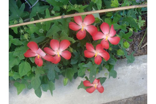 Hoa màu đỏ hoặc hồng, có phớt vàng ở giữa hoa. Mọc đơn ở kẽ lá và có đường kính khoảng 8cm. Cuống hoa dài khoảng 5 – 8cm, hơi phồng đầu và có phủ lông cứng. Đài hoa có 7 – 10 bộ phận, chiều dài khoảng 12 – 14mm, thường rụng sớm. Hoa thường có 5 cánh, dài từ 3 – 6cm, rộng từ 3 – 4cm.