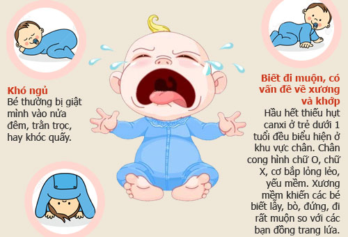 Trẻ em thiếu canxi thường có biểu hiện khóc đêm, đêm ngủ giật mình hay quấy khóc, dễ nổi cáu, rối loạn chức năng vận động, không tập trung tinh thần.