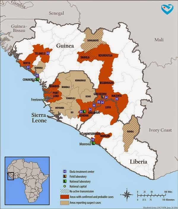 Tính đến thời điểm này, tức là chỉ 4 tháng trôi qua kể từ khi Ebola được phát hiện, virus này đã lan tới 4 nước Tây Phi, bao gồm: Guinea, Liberia, Sierra và Nigeria, với số người nhiễm bệnh lên đến hơn 1300 người và số người tử vong là hơn 729 người. Trong số những người đã mắc Ebola, có rất nhiều người Mỹ và các quốc gia khác bị nhiễm do tới các vùng dịch để kiểm soát dịch bệnh lây lan. Trước sự bùng phát dữ dội này, Ebola được ví như một cơn cháy rừng và các nước châu Âu, châu Á đang đặt cảnh giác cao độ bởi Ebola có thể tràn sang các châu lục khác bất cứ lúc nào.